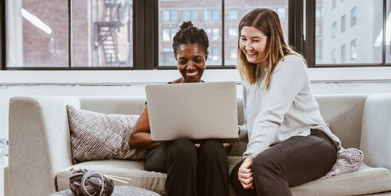 Older adult woman and younger woman looking at a laptop screen, smiling.