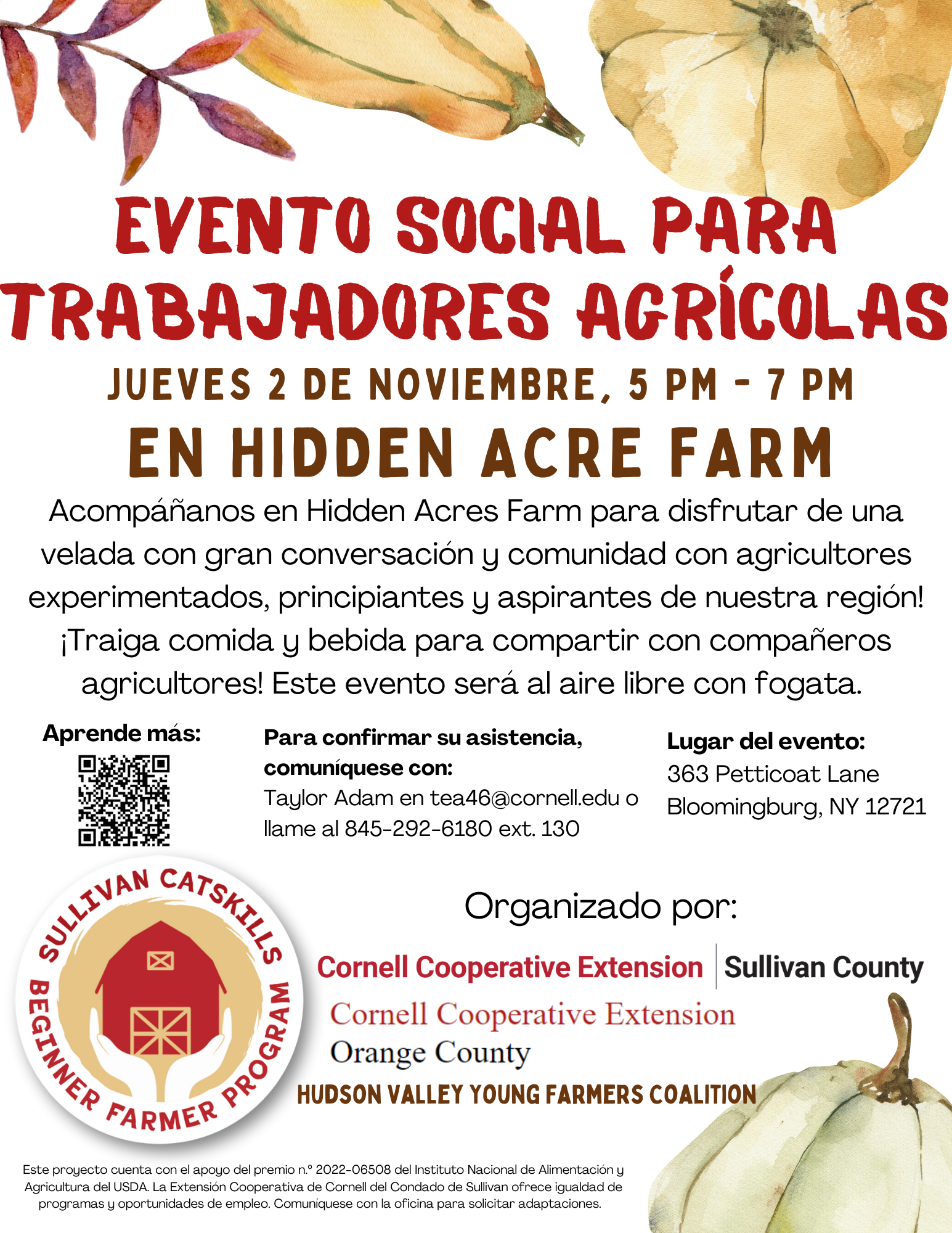 ¡Este evento es organizado por la Extensión Cooperativa de Cornell del Condado de Sullivan, la Extensión Cooperativa de Cornell del Condado de Orange, y la Coalición de Jóvenes Agricultores del Valle de Hudson.